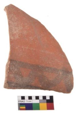 | Description / विवरण | A specimen of a potsherd. It is reddish in colour with black decorative geometric painting on it. |