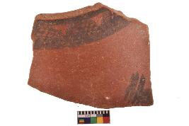 | Description / विवरण | Specimen of black on red ware with decorative geometric Latticed loops set in two horizontal bands painting. |