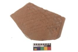 | Description / विवरण | Specimen of black on red ware with black decorative Lattice pattern geometric painting. |