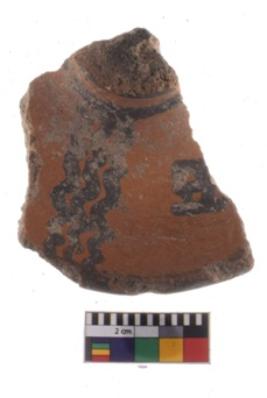 | Description / विवरण | A fragment of a potsherd. It is reddish in colour with black decorative geometric painting on it. |