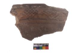 | Description / विवरण | A fragment of a potsherd. It is reddish in colour with black decorative geometric painting on it. |