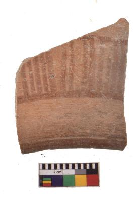 | Description / विवरण | Specimen of red on red ware with decorative geometric Vertical strokes set in two horizontal bands painting. |