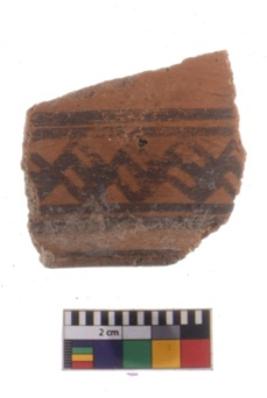 | Description / विवरण | A fragment of a potsherd. It is reddish in colour with black decorative geometric painting on it. |