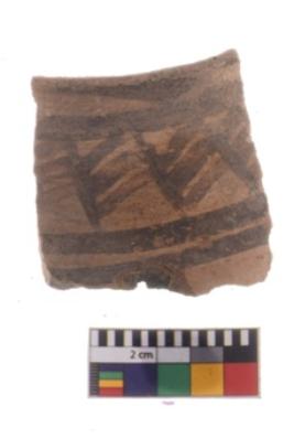| Description / विवरण | A fragment of a potsherd. It is reddish in colour with black decorative geometric painting on it. |