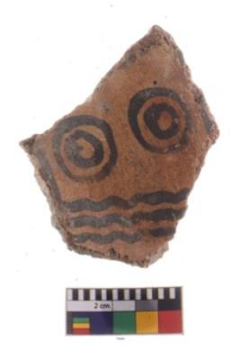 | Description / विवरण | A fragment of a potsherd. It is reddish in colour with black decorative geometric painting on it. |