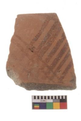 | Description / विवरण | Specimen of black on red ware with black decorative Lattice pattern geometric painting. |