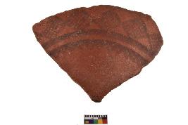 | Description / विवरण | Specimen of black on red ware with decorative geometric A row of latticed diamonds set in horizontal bands but having groups of oblique lines at intervals painting. |