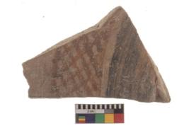 | Description / विवरण | Specimen of black on red ware with black decorative Lattice pattern geometric painting. |