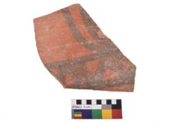 | Description / विवरण | A specimen of a potsherd. It is reddish in colour with black decorative geometric painting on it. |