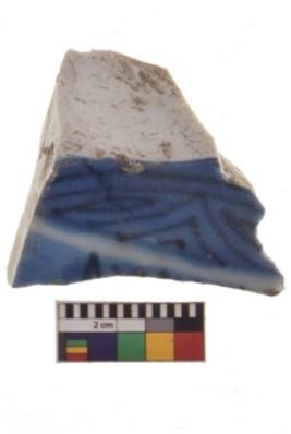 | Description / विवरण | Specimen having glossy white surface with blue and black painting on it. |