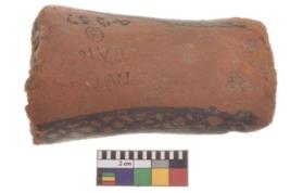 | Description / विवरण | Specimen of black on red ware with decorative geometric Two horizontal bands containing criss-cross pattern painting. |
