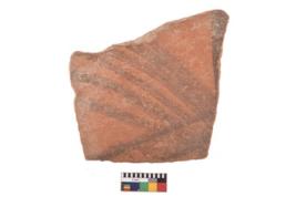 | Description / विवरण | A specimen of a potsherd. It is reddish in colour with black decorative geometric painting on it. |