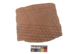 | Description / विवरण | Specimen of black on red ware with black decorative Lattice pattern geometric painting. |