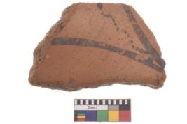 | Description / विवरण | Specimen of black on red ware with decorative geometric Broad two lines with doted latticed band painting. |