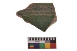| Description / विवरण | Specimen having glossy green surface with two engraved linear design. |