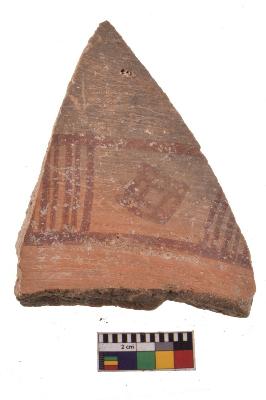 | Description / विवरण | Specimen of red on red ware with decorative geometric A groups of vertical lines set in horizontal bands and latticed diamonds painting. |