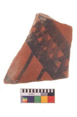| Description / विवरण | Specimen of potsherd with black decorative geometric Set of two zigzag bands painting, Type Black on Red Ware . |