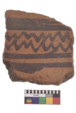 | Description / विवरण | Specimen of black on red ware with decorative geometric Double vertical zig-zag band set in two horizontal bands painting. |