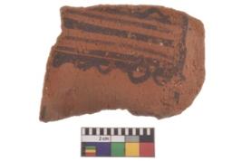 | Description / विवरण | Specimen of black on red ware with decorative geometric A row of arches over a horizontal band painting. |