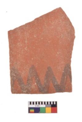 | Description / विवरण | A specimen of a potsherd. It is reddish in colour with black decorative geometric painting on it. |