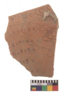 | Description / विवरण | Specimen of black on red ware with black decorative Parallel wavy lines and dots geometric painting. |