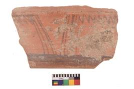 | Description / विवरण | A specimen of a potsherd. It is reddish in colour with black decorative geometric painting on it. |