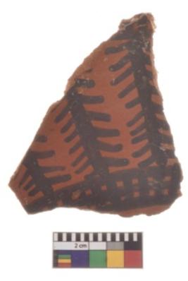 | Description / विवरण | Specimen of black on red ware with decorative geometric Pattern of slanting lines and plant motif painting. |