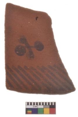 | Description / विवरण | Specimen of black on red ware with decorative geometric Outcurved lines and two dots design painting. |