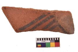 | Description / विवरण | Specimen of black on red ware with decorative geometric parallel lines painting. |