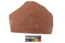 | Description / विवरण | Specimen of black on red ware with black decorative Lattice pattern geometric painting. |