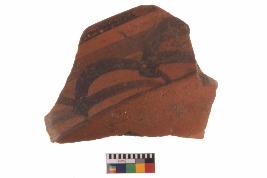 | Description / विवरण | Specimen of potsherd with black decorative geometric Set of triple aches painting, Type Black on Red Ware . |