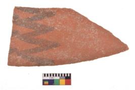 | Description / विवरण | A specimen of a potsherd. It is reddish in colour with black decorative geometric painting on it. |