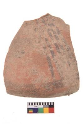 | Description / विवरण | A specimen of a potsherd. It is reddish in colour with black decorative geometric painting on it. |
