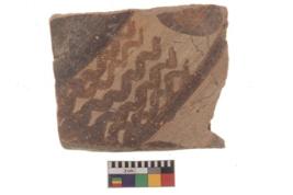 | Description / विवरण | Specimen of black on red ware with black decorative Parallel wavy lines geometric painting. |