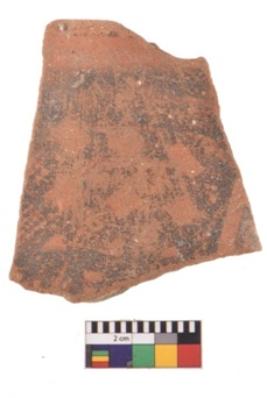 | Description / विवरण | A specimen of a potsherd. It is reddish in colour with black decorative geometric painting on it. |