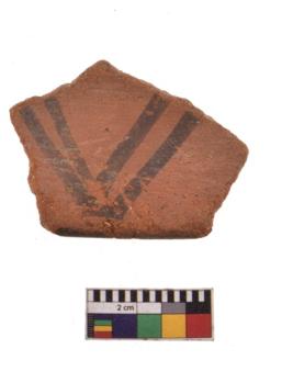 | Description / विवरण | Specimen of black on red ware with decorative geometric Two sets of two oblique bands in opposite direction painting. |