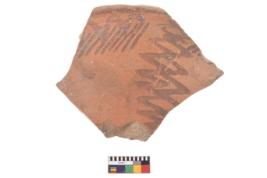 | Description / विवरण | A specimen of a potsherd. It is reddish in colour with black decorative geometric painting on it. |