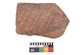 | Description / विवरण | A specimen of a potsherd. It is reddish in colour with black decorative geometric painting on it. |