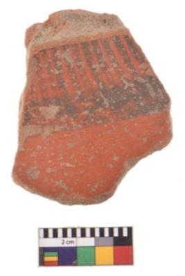 | Description / विवरण | A specimen of a potsherd. It is reddish in colour with black decorative geometric painting on it. |