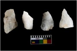 | Description / विवरण | Specimen of cores with weathered cortex and several broad fluted marks. Some of them are irregular in shape, whereas some are tapering at one end. |