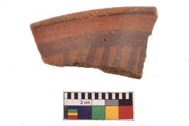 | Description / विवरण | Specimen of black on red ware with decorative geometric Vertical strokes set in two horizontal bands painting. |