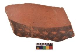 | Description / विवरण | Specimen of black on red ware with decorative geometric A row of latticed diamonds set in horizontal bands but having groups of oblique lines at intervals painting. |