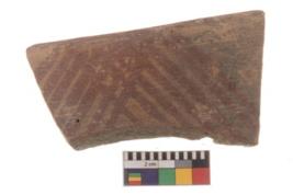 | Description / विवरण | Specimen of black on red ware with black decorative Lattice pattern geometric painting. |