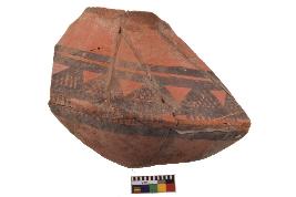 | Description / विवरण | Specimen of black on red ware with decorative geometric Latticed loops set in two horizontal bands and oblique lines painting. |