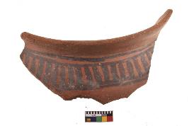| Description / विवरण | Specimen of black on red ware with decorative geometric Vertical strokes set in two horizontal bands painting. |