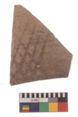 | Description / विवरण | Specimen of black on red ware with black decorative Lattice pattern geometric painting. |