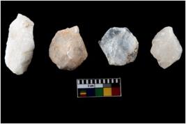 | Description / विवरण | Specimen of cores with weathered cortex and several broad fluted marks. Some of them are irregular in shape, whereas some are tapering at one end. |