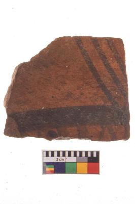 | Description / विवरण | Specimen of potsherd with black decorative geometric Linear painting, Type Black on Red Ware . |