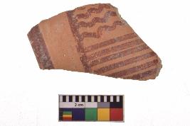 | Description / विवरण | Specimen of red on red ware with decorative geometric Vertical strokes set in two horizontal bands and latticed lines painting. |