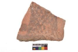 | Description / विवरण | A specimen of a potsherd. It is reddish in colour with black decorative geometric painting on it. |